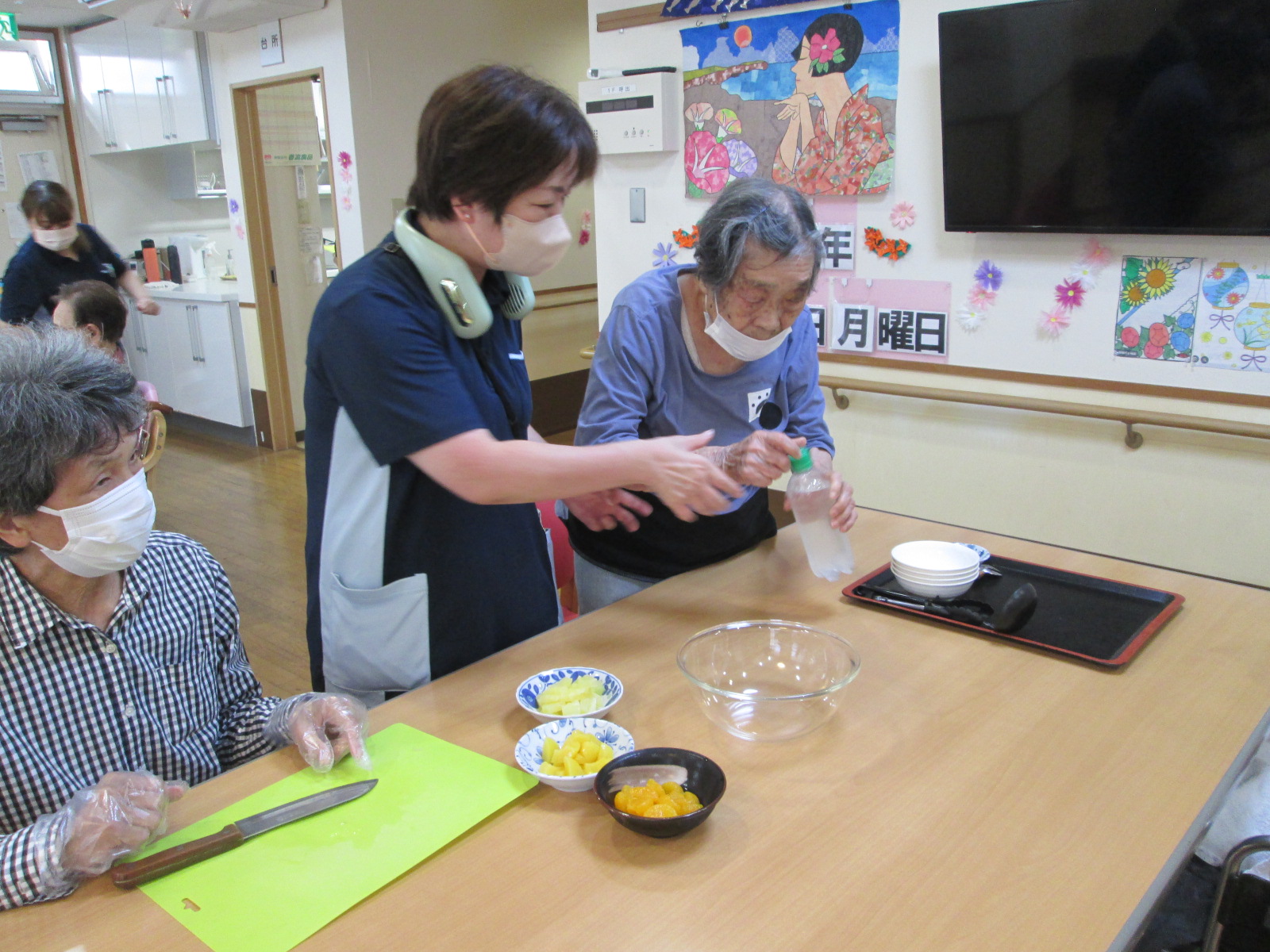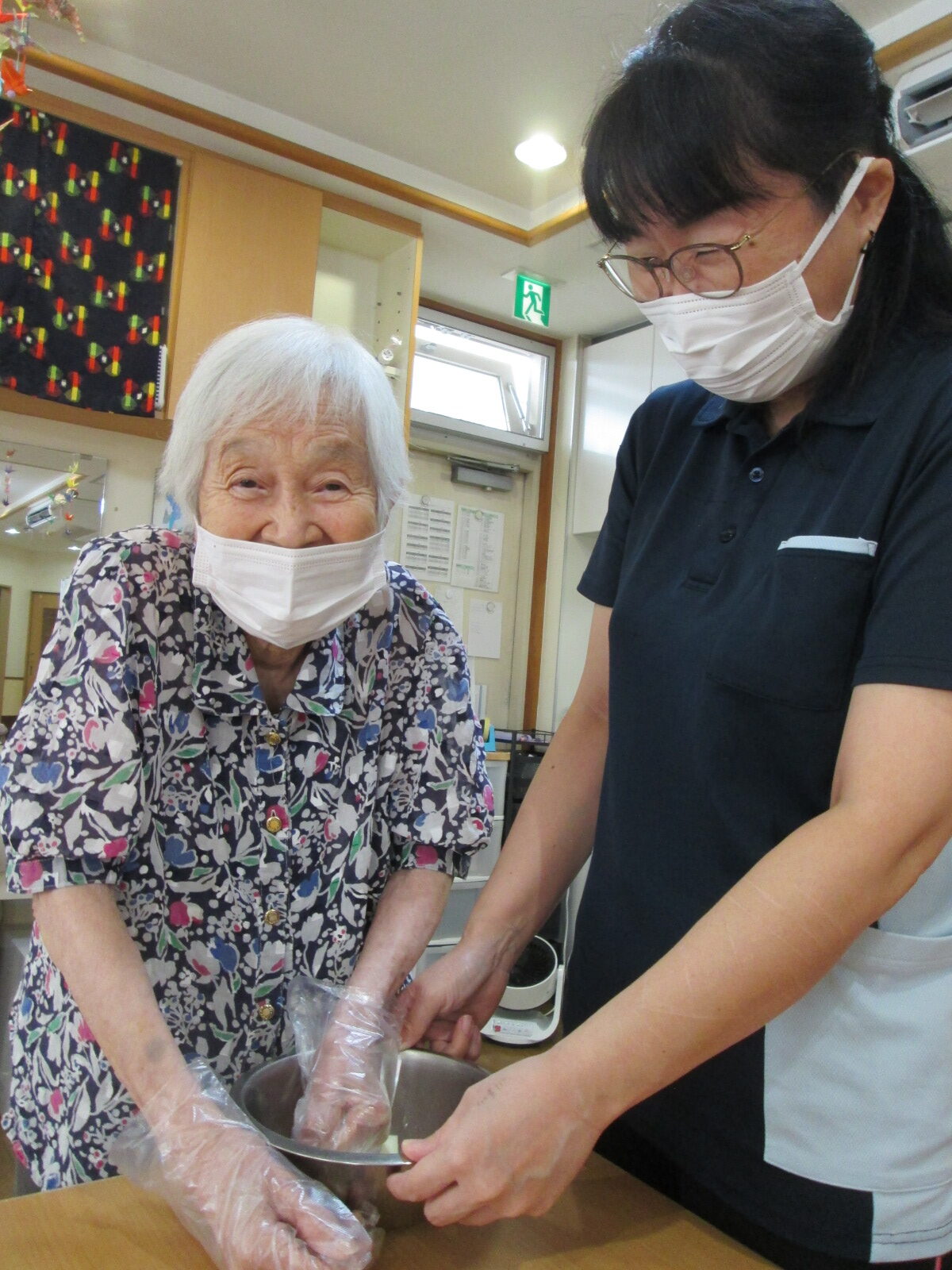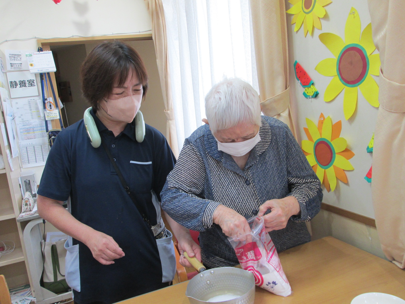 デイサービスセンター太陽・荒子ではまだまだ暑さ本番の8月と9月に、ご利用者様と楽しく美味しいおやつ作りをしました。