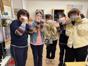 毎日、訪問させていただいているご利用者様の娘様より、手編みのレッグウォーマーをいただきました。